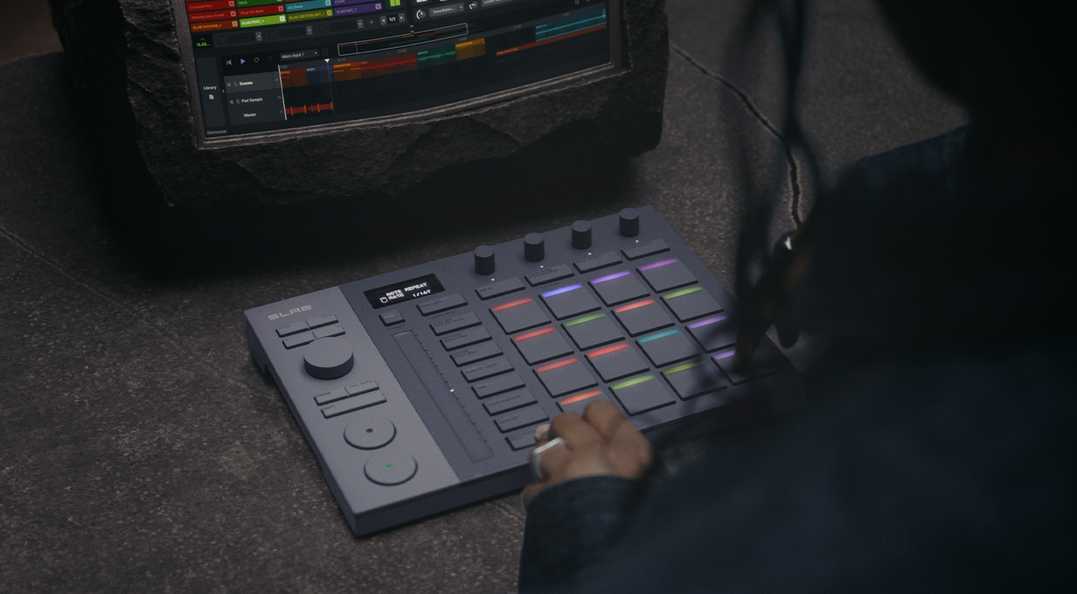 SLAB es un controlador elegante y compacto que se conecta al ordenador vía USB-C. Tiene 16 pads RGB para creación de ritmos y es sensible a la velocidad y al aftertouch, además de montar cuatro botones dedicados adicionales sobre las almohadillas, que permiten cambiar entre los diferentes modos de trabajo que ofrecen los pads, como el modo Pad FX, donde se asignan diferentes tipos de efectos a los pads, y después de pueden activar de diversas formas.