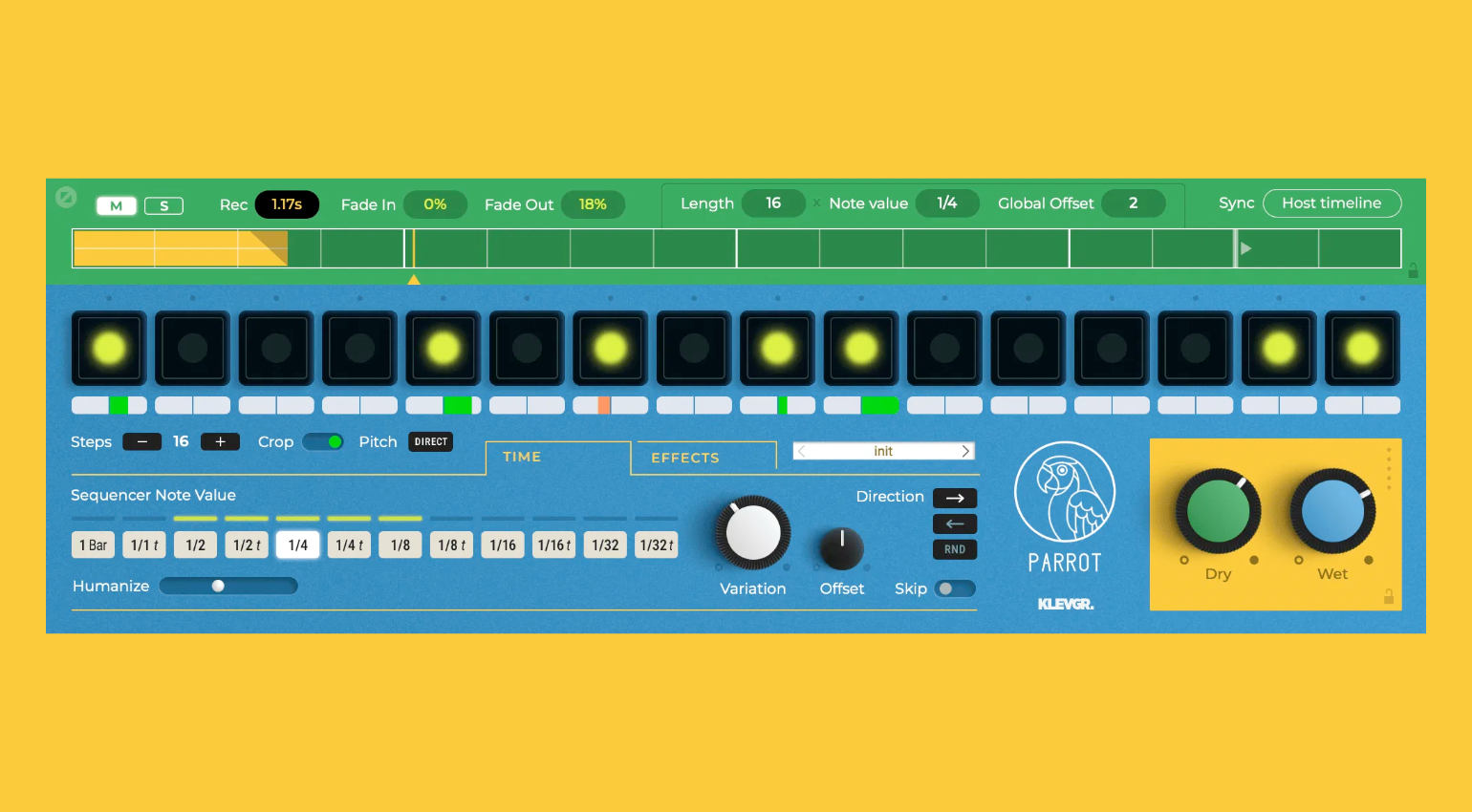 Independientemente de que sincronices el secuenciador o no, Parrot se puede usar para crear patrones rítmicamente estables o disonantes que le aportarán mucha intensidad y una nueva dimensión a tus canciones. Además, el nuevo plugin de Klevgrand puede ser muy útil para crear texturas y paisajes sonoros cuando lo combinas con tu reverb favorita. Y a medida que los ritmos generados se vayan reproduciendo en loop, podrá experimentar con el tono, la modulación y el tiempo para alterar completamente tu interpretación.