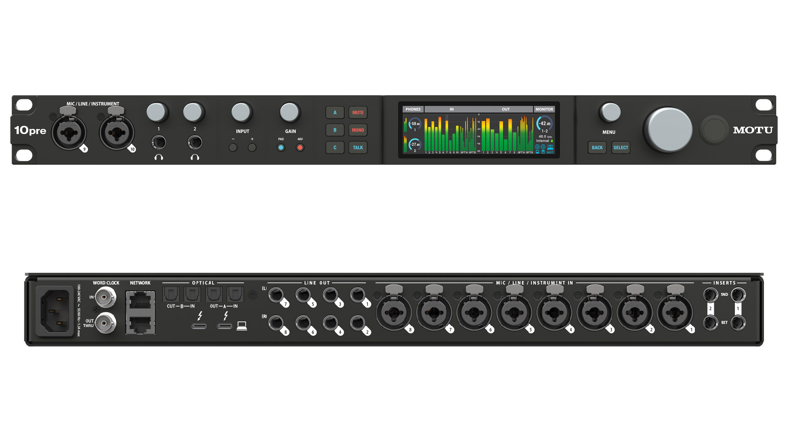 La nueva MOTU 10pre es una versátil interfaz de audio para montar en rack con 10 previos de micro, conectividad AVB y un sistema de mezcla DSP integrado.