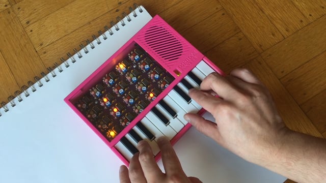 Hay un chip 555 para cada nota y estas se visualizan tras el plexiglass y se encienten cuando son tocadas. Tommy dice que la única razón por la que optó por una polifonía de 20 voces es que 20 de estas se alineaban de una forma genial en la placa de circuitos. Las características incluyen una rueda de control de volumen impresa en 3D, interruptores y un «portalápices» donde puedes ubicar algún lápiz. No tiene más controles o interacción con el sintetizador, tienes 20 notas y teclas para encender y apagar, lo cual probablemente significa que no es realmente un sintetizador después de todo – aunque es muy divertido.